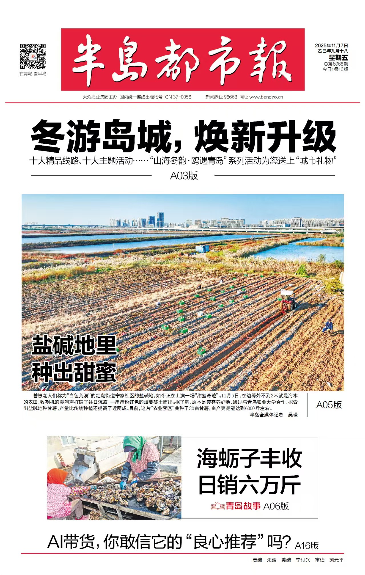 深秋的胶州湾,海风裹挟着盐霜拂过阡陌。在渔民收网归航的时节,人们也正弯腰收获那片被海水滋养的农作物——耐盐碱甘薯的果实,他们在此刻共绘出一幅咸涩与甘甜交织的秋收图卷。