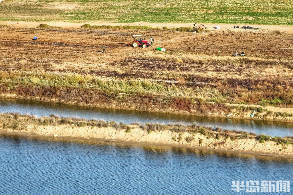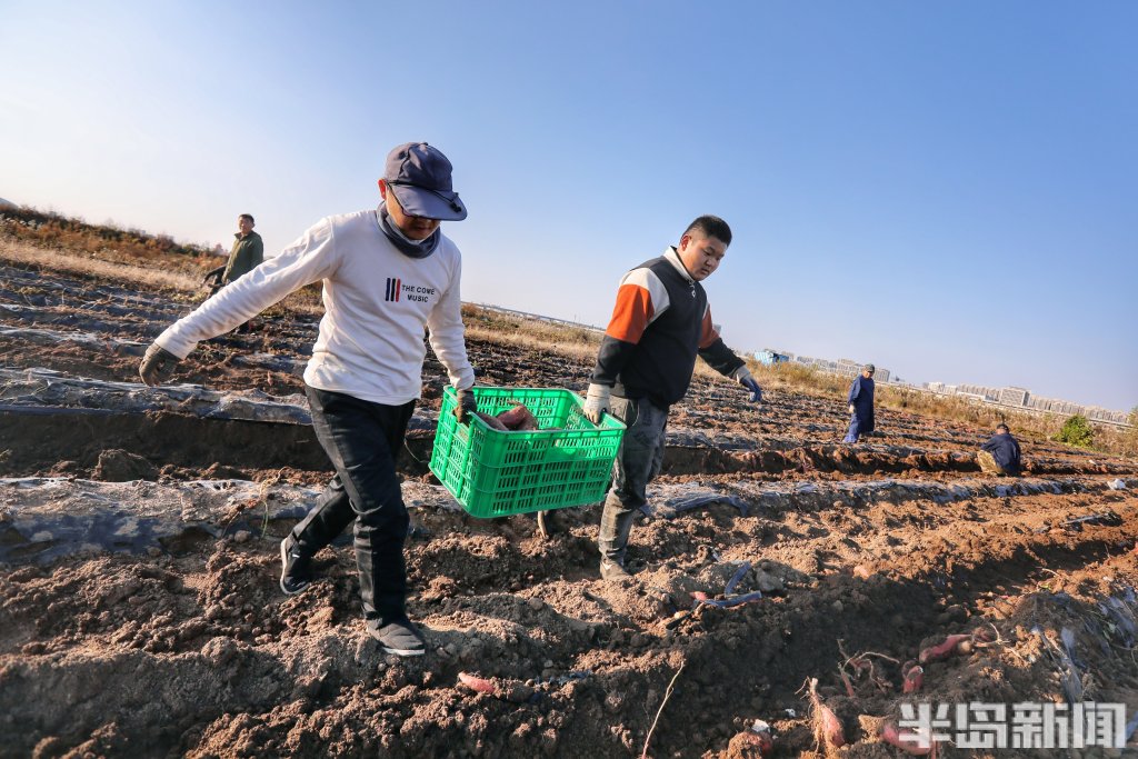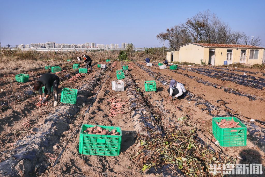 深秋的胶州湾畔,海风裹挟着咸湿的气息。青岛城阳区红岛街道宁家社区的盐碱地里,收割机的轰鸣声打破了往日的沉寂。铁齿犁开泛着碱白的土地,一串串粉红色的烟薯破土而出,在阳光下闪着湿润的光泽。工人们弯腰捡拾,身后,新翻的泥土与远处依旧板结的荒芜土地,形成刺目的对比。