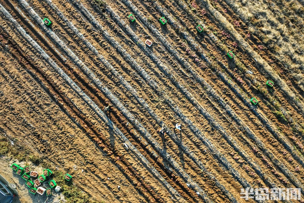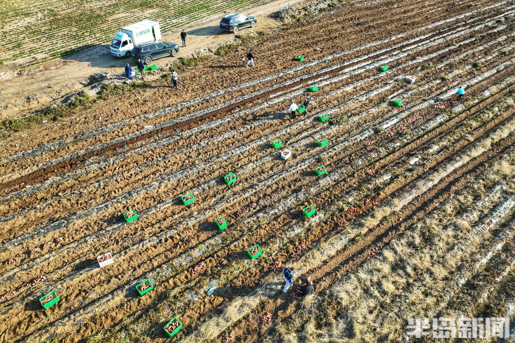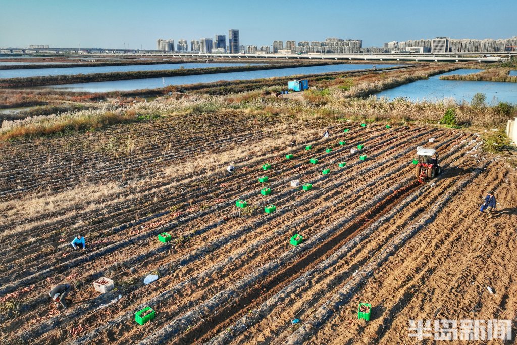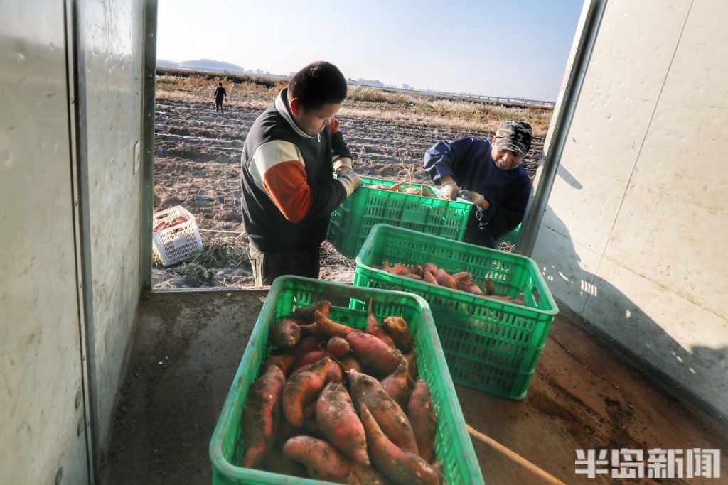 在这片毗邻海水的土地上,人们正在收获着甘甜的耐盐碱品种“烟薯25”。
