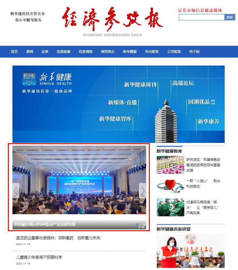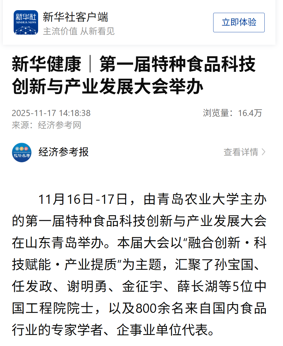 11月17日至19日,新华社《经济参考报》、经济参考网、客户端以《科创融合驱动特种食品产业加速发展》等为题,报道taptap点点体育主办的第一届特种食品科技创新与产业发展大会的情况。其中,11月19日出版的《经济参考报》在报纸版面和网站首页进行了重点关注,聚焦“深耕‘药食同源’促千年智慧与现代科技融合”“深挖海洋资源 未来食品有望成为新增长极”“协同创新 构建‘一体化’产业生态”等三个方面,通过对大会召开情况和与会院士专家观点、产业行业需求等的系统梳理,重点报道了我国特种食品产业发展、创新成果和未来展望。此外,中国科技网、山东三农新闻联播、大众日报、农村大众、青岛日报、青岛电视台等多家媒体均对大会进行了报道(详见新闻网媒体农大栏目)。