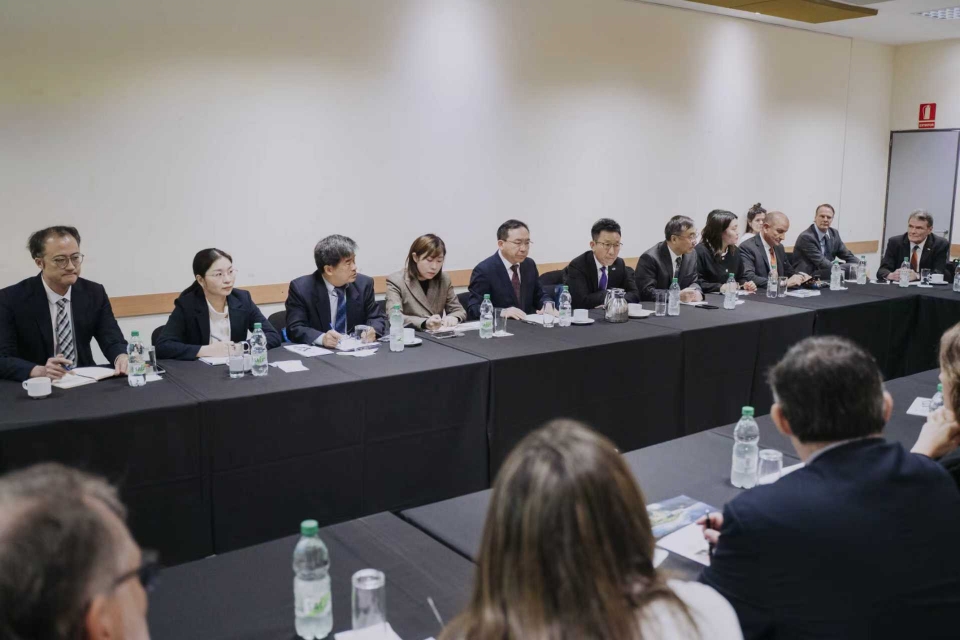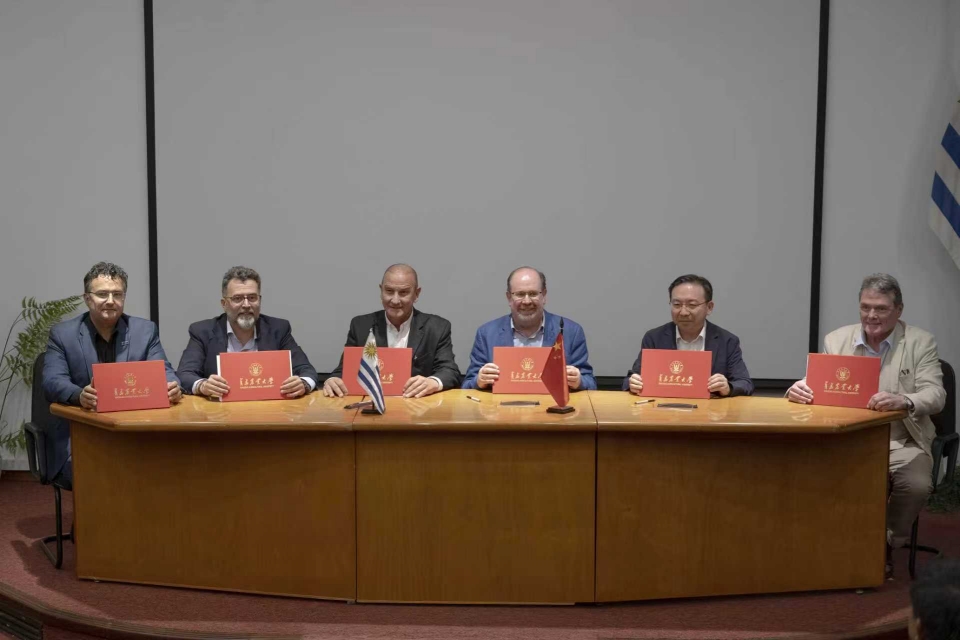 访问乌拉圭国家农牧业研究院、新发展公司期间,赵金山与乌拉圭国家农牧业研究院主席米格尔・谢拉、院长赫拉尔多・马尔凯西尼、新发展公司首席执行官卢卡斯・博尔哈特及相关领域专家学者座谈。双方围绕中国-乌拉圭草地农业联合实验室共建事宜,就实验室科研方向、技术创新路径及产业转化落地等核心议题深入磋商,达成广泛共识,并共同签署《草地农业联合实验室共建谅解备忘录》。根据协议,该实验室将以“草地农业”为核心,聚焦饲草生产利用遗传改良与植物生物技术、数字化草地农业研发应用、肉牛育种精准遗传改良三大领域,通过联合研发、技术示范、产业赋能和人才培养,探索构建低碳农业技术体系,加速先进技术双向转化落地,打造中乌智慧草地农业顶尖合作平台。乌拉圭牧农渔业部副部长马蒂亚斯・卡兰布拉见证签署并表示热烈祝贺。